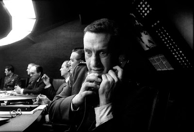 Antes hablaba de atacar a la falta de coordinación entre poder militar y ejecutivo. Pues bien, esta denuncia también está presente en ¿Teléfono rojo?... y, de nuevo, creo que da pie a otro de los mejores momentos de la cinta. En este caso me refiero a la hilarante escena en la que el Presidente Merkin Muffly (Peter Sellers) explica por teléfono a su homólogo soviético Dimitri que van a ser atacados por la aviación norteamericana. Esta situación es generada debido a la imposibilidad de comunicación entre la sala de operaciones del Pentágono y el general Jack D. Ripper (vaya nombre), artífice del ataque contra los soviéticos. En este caso lo grotesco y lo absurdo sirven inteligentemente a esa denuncia a la falta de coordinación entre dos instituciones que debieran ser especialmente eficaces en dicho aspecto.