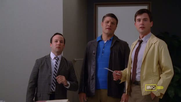 Se trata de un episodio céntrico de Peggy, que tiene su réplica, como no podría ser de otra manera, en Don Draper, su gran valedor en la agencia, con el que, por otra parte, ha mantenido no pocos enfrentamientos. Pero por otra parte, estamos ante un capítulo muy complejo y rico, condensado con gran perspicacia para que los diferentes elementos sean lo suficientemente significativos y al mismo tiempo quepan sin atropellarse en 45 minutos. En mayor o menor medida, se reabren o por lo menos se realizan notables referencias a varias tramas del pasado, aparentemente cerradas o que habían quedado en suspensión, con la consiguiente reaparición de los respectivos personajes. Así como líneas argumentales o eventos más recientes, como podemos comprobar a través de rasgos que nos remiten al episodio inmediatamente anterior. Ken Cosgrove aparece completamente integrado en la nueva agencia, de la que ahora también forma parte Danny, aquel inepto aspirante cuyo golpe de suerte (o carambola etílicamente motivada, como le queráis llamar) le abrió las puertas. Ahora forma un equipo bastante peculiar con el vacilón de Joey y el macarra de Rizzo, personajes igualmente introducidos en esta temporada: todo un “trío calavera” que de seguro nos traerá buenos momentos cómicos.