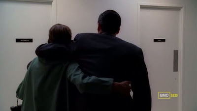 Por primera vez, el incansable, pétreo e inquebrantable Don Draper, o Dick Whitman si preferís, se hunde y se desconsuela ante la adversidad, ante la pérdida de la única persona que realmente lo conocía, la única persona que lo quería y apreciaba por lo que era, y no por lo que aparentaba ser. Peggy, presente, acude a consolarlo, sabiendo que sólo ella en toda la agencia comprende a este hombre. Este momento maternal de la alumna con el maestro invierte la dialéctica casi paternalista que regía hasta ahora la relación entre ambos, no exenta de baches. Por algo le confesó Draper, en la pasada season finale, que si la trataba con dureza era porque la veía como la extensión de sí mismo.